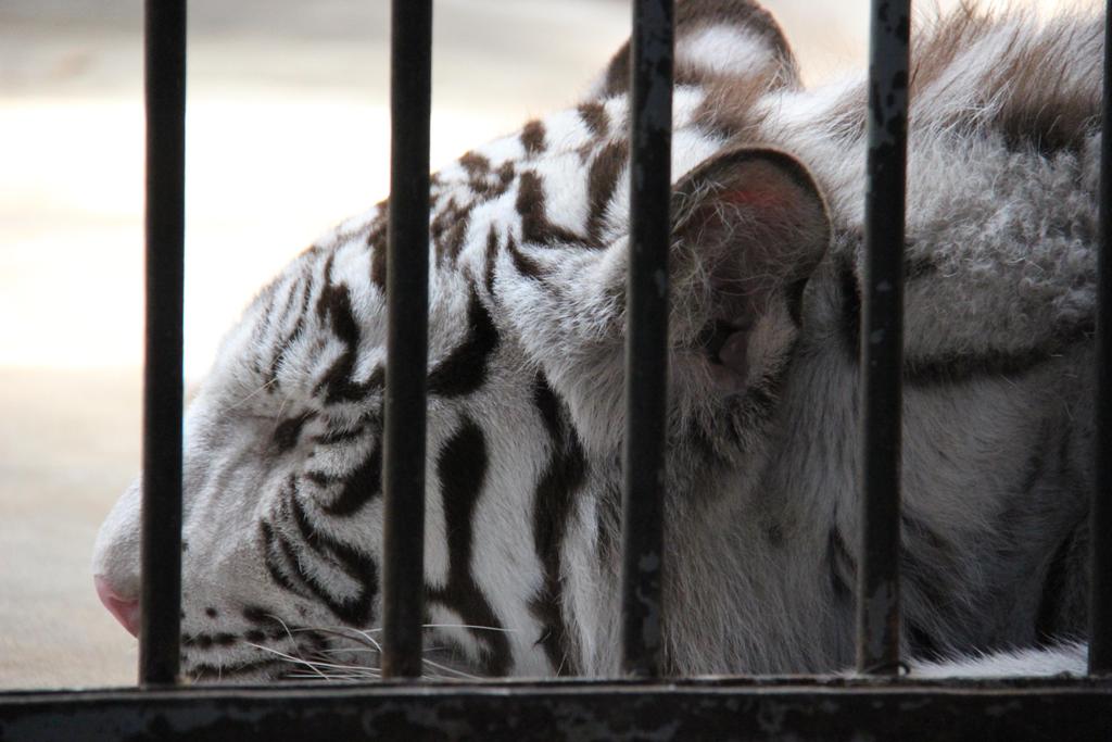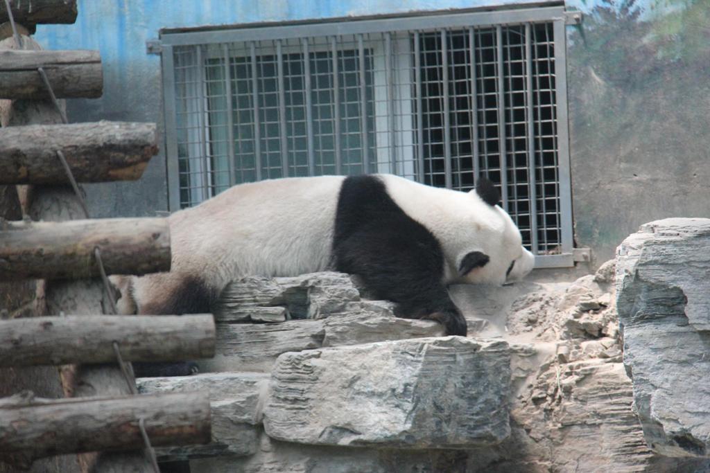 Не смотря на то, что территория большая, а вход достаточно дешевый, складывается ощущение, что звери сами на себя работают в зоопарке. Причем судя во животным это происходит после ухода последнего посетителя зоопарка или ночью, когда никто не видит. И продолжается сие мероприятие до самого утра. Практически куда бы я не зашел – все спали, причем кто как смог устроится, тот так и уснул… И обыкновенная панда, практически доедающая свою еду в полусне, и другой вид панды, спящий на дереве под обильное поливание водой сверху из шланга, и белый тигр – все отдыхают после ночной смены.